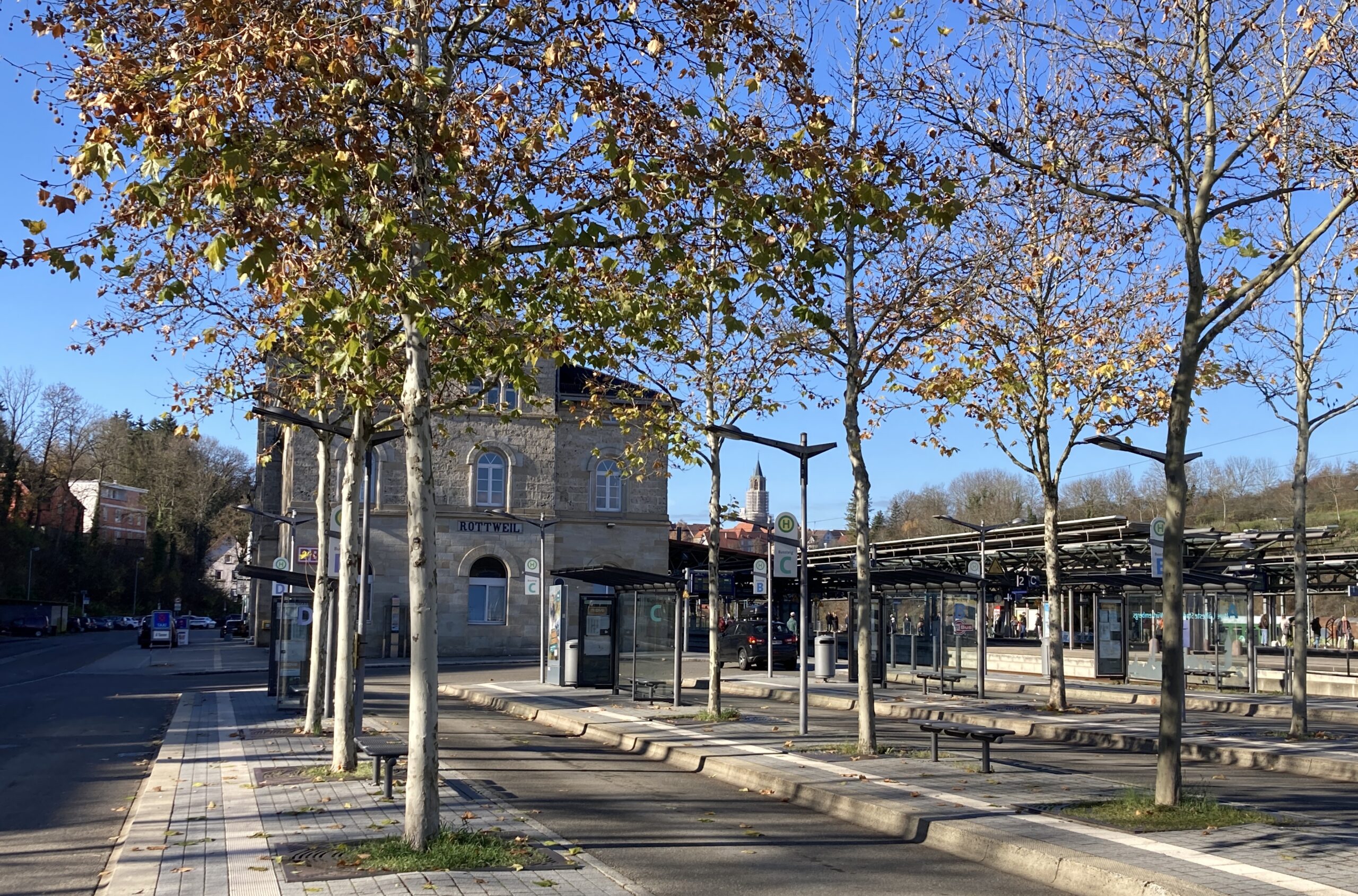 - Stadtbus: Bushaltestellen befinden sich in unmittelbarer Nähe des Bahnhofs. Die Busse fahren regelmäßig in Richtung Innenstadt, die Fahrt dauert nur etwa 5 Minuten. Am Wochenende verkehren in Rottweil weniger Buslinien als werktags, und die Fahrpläne sind teilweise ausgedünnt. Es empfiehlt sich daher, die aktuellen Abfahrtszeiten vorab über Fahrplanauskunft zu prüfen.